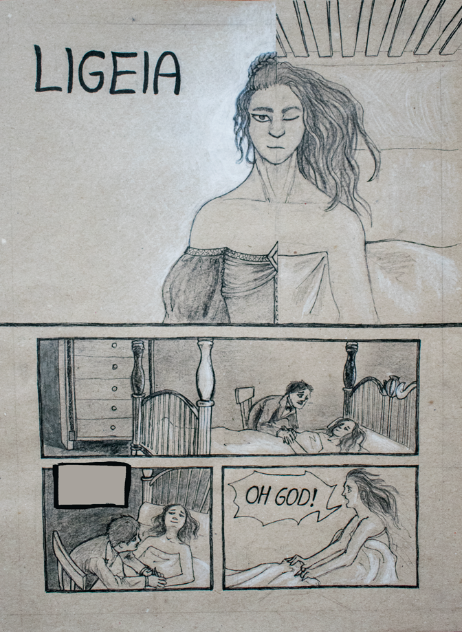 Some more comic progress! The first page was a first test but the teacher didn’t really like it, it lacked contrast and drawing it with fineliner would make it to soft and delicate for what’s basically a horror story. So I went on an experimented with water-soluble pencil on wet paper – I got nice black expressive lines but the paper couldn’t take water very well… And I really wanted to use this paper because I like the color and when I draw on it with black and white it reminds me of old photographs and gravures.. And it’s cheap. I did another test where I drew the panels first and then went over it with water but it didn’t feel right yet..